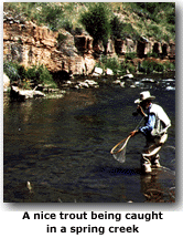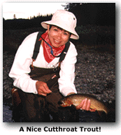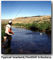 Secondly, there are the low land/foot hill tributaries, often found in the middle sections of a primary river. These streams are somewhat warmer than the headwater tributaries and tend to produce rainbow and brown trout rather than cutthroat. The low land/foot hill tributaries are most likely to be located on private ranches, running through pastures or hay fields, but can also be found closer to developed areas such as roads and towns. These streams may have sections, which have suffered from the destruction of riparian vegetation and stream bank erosion (Due to man’s interference or cattle overgrazing.), but in the other areas in which the streamside habitat remains in a natural state, the trout populations are high.
