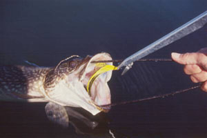 Northern pike have extremely sharp teeth and can inflict a nasty wound. One should always use jaw spreaders and a "hook out" or long nose pliers to help remove the hook. Pike can be landed by hand and one technique for smaller fish is to grab the fish tightly behind the head and over the gill covers. Larger fish can be tailed and then lifted under the throat to get the fish out of water